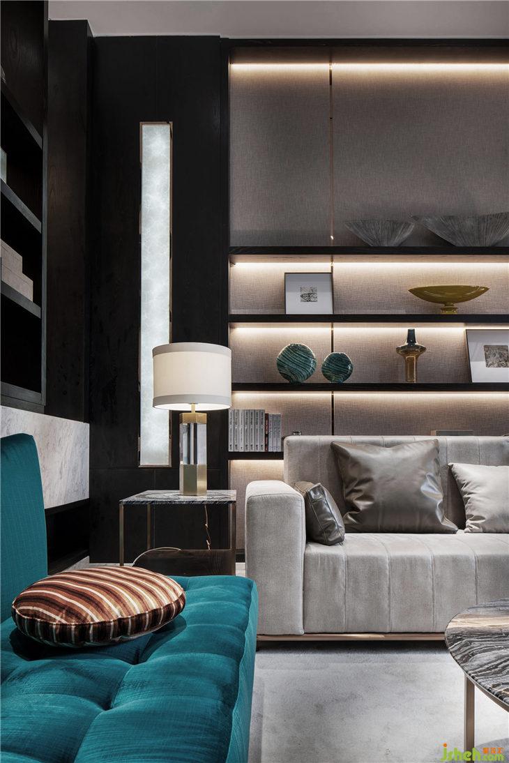 灰色石材,質(zhì)感的布藝沙發(fā),低調(diào)而高雅的材質(zhì)烘托出無(wú)壓迫感的氛圍。