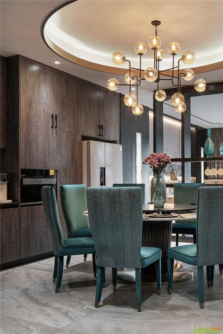在陳設(shè)設(shè)計(jì)上,通過(guò)挺闊的輪廓線條和大氣的造型呼應(yīng)并加強(qiáng)了某種藝術(shù)性的散發(fā)審美。深色木飾面的色調(diào)圍繞空間,下沉式客廳帶給你包圍式的放松。
