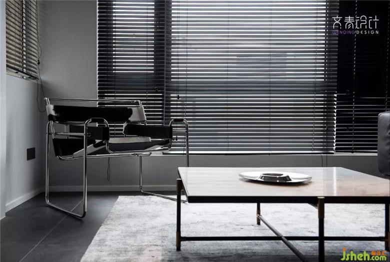 窗簾是少見的黑百葉簾,代替普通布質(zhì)窗簾,不論陽光或是用燈光,光線都可以比較適宜。主茶幾買自線性公園。