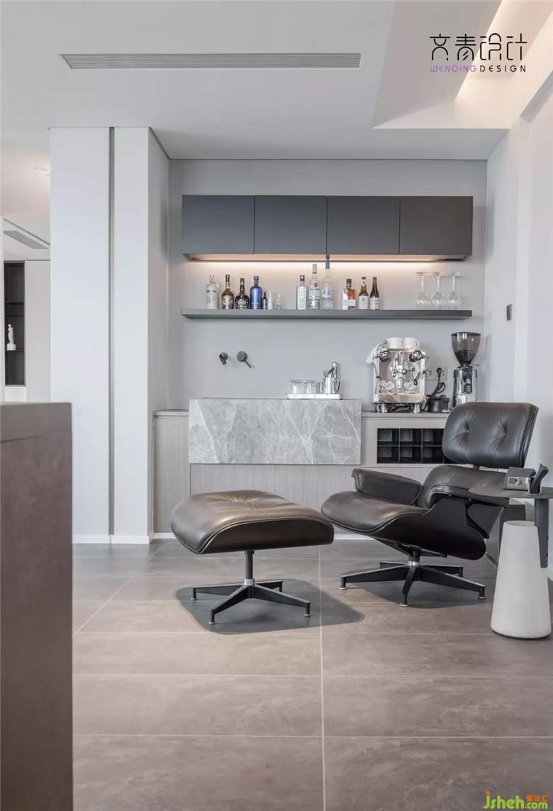 進(jìn)門的右側(cè)還有一個(gè)酒柜區(qū)域,這可是個(gè)衍生的區(qū)域,滿足業(yè)主閑暇的時(shí)候喝點(diǎn)小酒,制作咖啡的空間,還有一把可以躺著無比舒適的躺椅。滿足感爆棚。