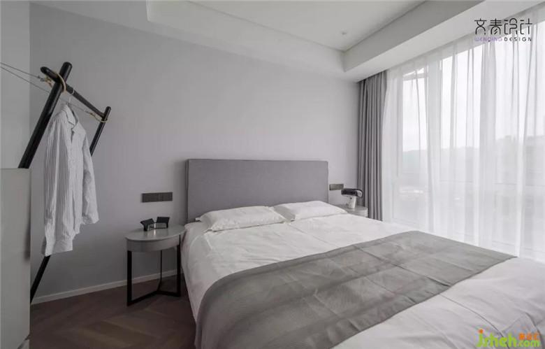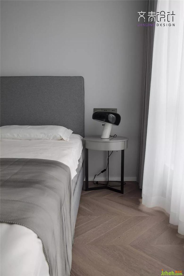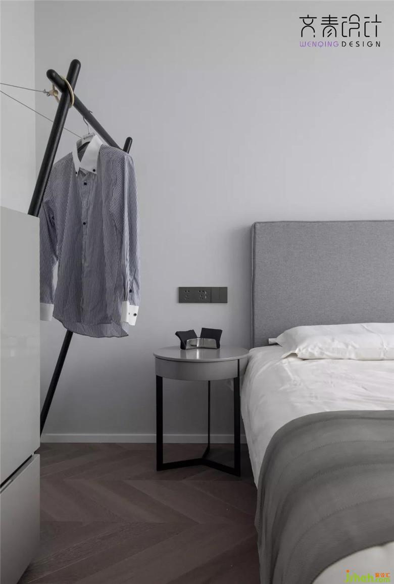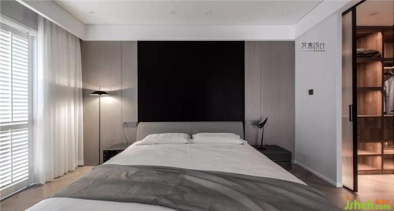 落地?zé)艉痛差^純黑鏤空金屬床頭柜,木飾面用的也是比較經(jīng)典的色系。