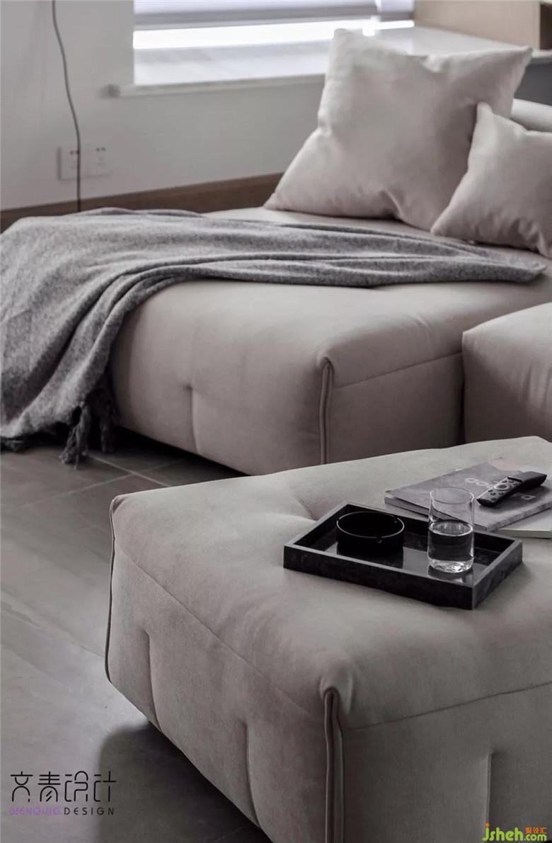 主是個十足的游戲控,除了安裝完現有的游戲設備還有掌機外,他還想買個體感游戲設備。因此,設計師除了將客廳范圍面積擴大之外,沙發(fā)選用了移動輕便模塊式沙發(fā)。這種沙發(fā)高度沒有普通沙發(fā)那么高,成人可以站坐在沙發(fā)背上。