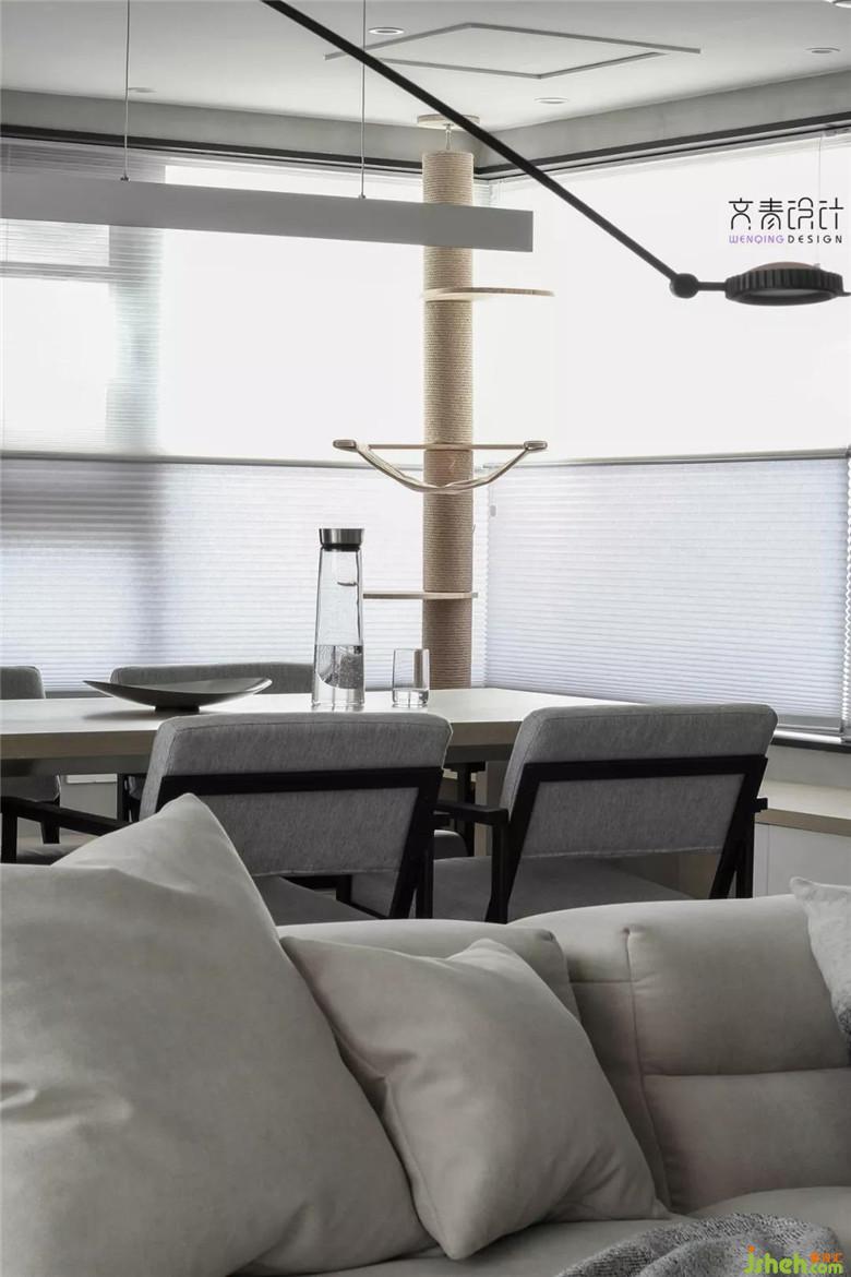 這種硬裝時就做在墻里的超長木作餐桌,讓餐廳似乎成了客廳和擼貓區(qū)的一個隔斷,配合相鄰客廳的模塊沙發(fā),這里餐桌的功能也不僅僅只用來就餐。在節(jié)奏緊快的杭州,工作不同的業(yè)主少有一起就餐的機會。模塊沙發(fā)和隔斷式的餐桌,讓一人就餐的同時,另一人也能安坐在沙發(fā)上一起享受休閑時光。