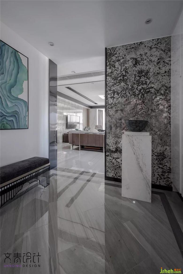 進(jìn)門,首先引入眼簾的,便是周正的門廳,花墨紋大理石墻面,金屬絲絨混搭的換鞋凳,隨眼可見的質(zhì)感在低調(diào)的展示著。