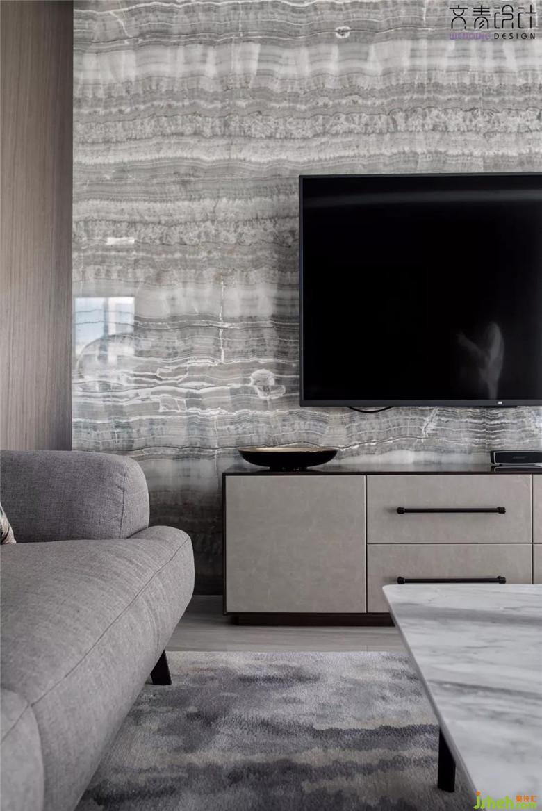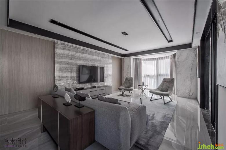 光潔的地面瓷磚與黑色的拉絲不銹鋼墻面,斑駁的反射著客廳的光線,兩廳線條感交相輝映。