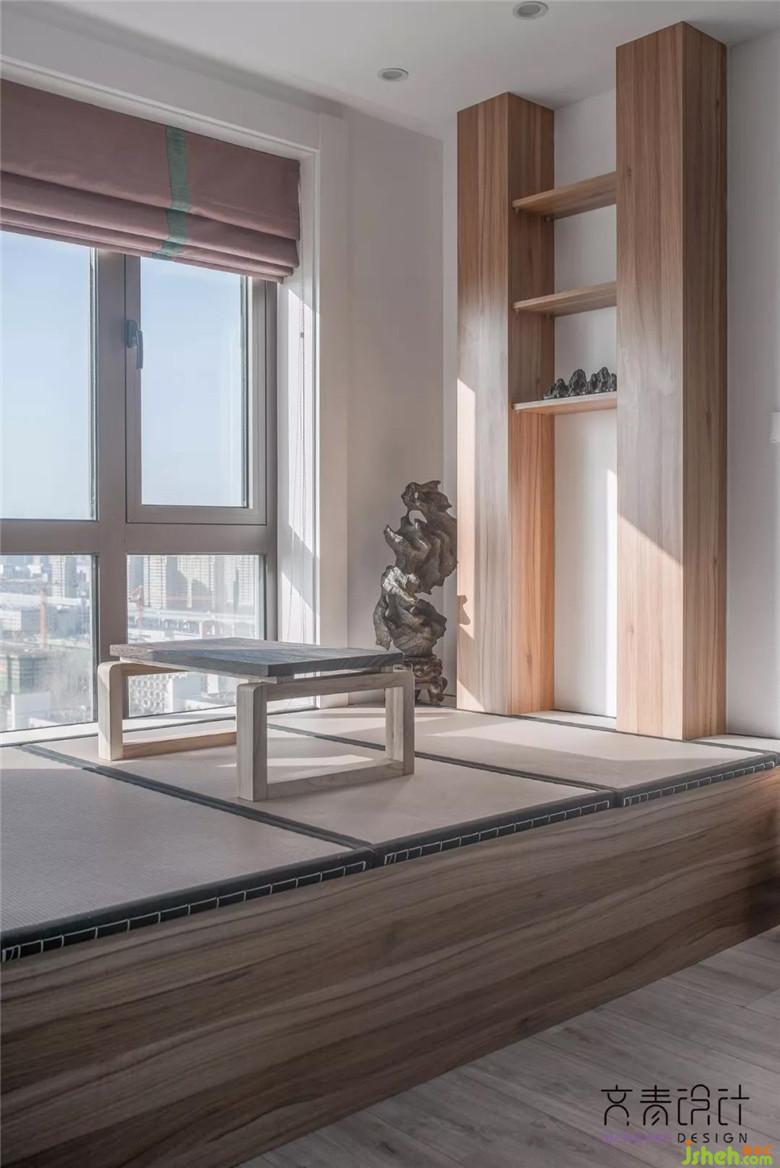 左側是條型的電腦辦公桌和整面的書墻,也可以放置男業(yè)主最愛的文玩收藏。右側是一片茶室榻榻米,西北朝向的書房,有兩面大窗,采光極好,夕陽西下時,陽光會透過窗,灑在榻榻米上,感覺十分靜謐,又溫暖。