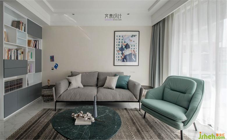 客廳墻紙帶了點(diǎn)暖色調(diào),選擇飽和度比較低的湖綠單人沙發(fā)搭寶墨抱枕,加上墻上的四葉草,給空間一些跳動(dòng)的元素。