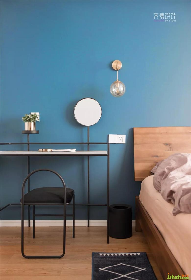 這套房子現(xiàn)代的硬裝,也定做了太多白柜子,若是不加入點顏色,未免太過樸素。于是這面調(diào)了多次的湖藍背景墻就出現(xiàn)了。
