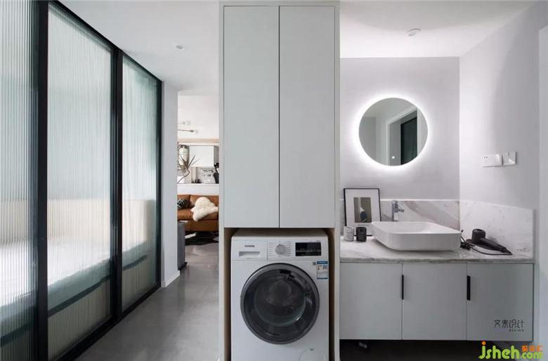 衛(wèi)生間干區(qū)的這面鏡子太招人喜歡了,一方面圓鏡讓人覺得儀式感十足,一方面鏡周的燈帶讓鏡子又是完美的化妝鏡。