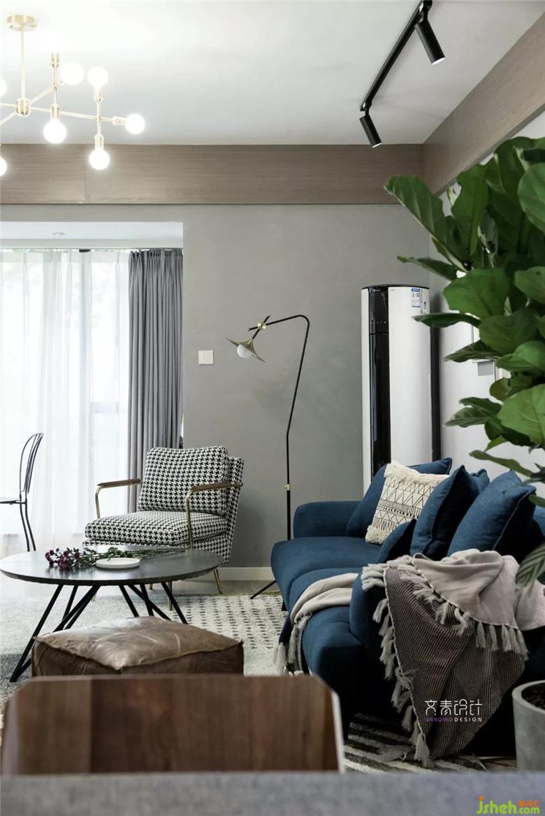 主沙發(fā)、單人懶人沙發(fā)等家具則是選用體態(tài)輕盈的款式;在低飽和度色彩的墻上作大塊面線條處理,以及組合裝飾畫修飾。