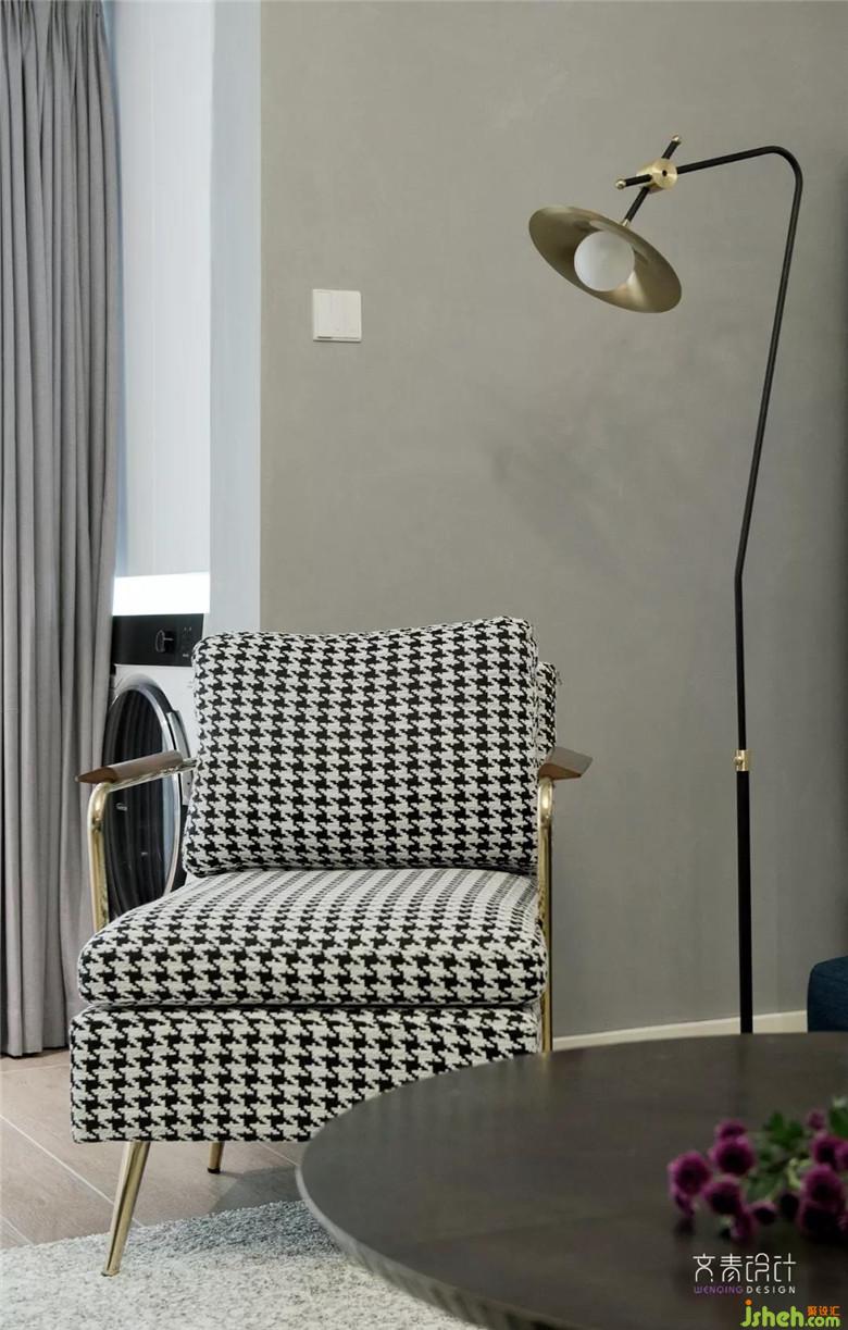 主沙發(fā)的藍跳出低飽和的框架,幾何紋路的地毯、蓋毯、抱枕與千鳥格單人沙發(fā)相呼應,不跳脫也帶小資的情調。