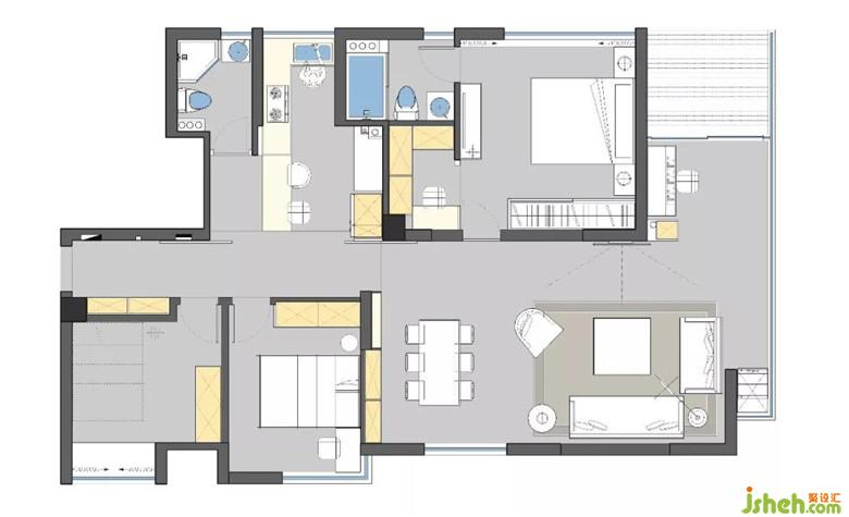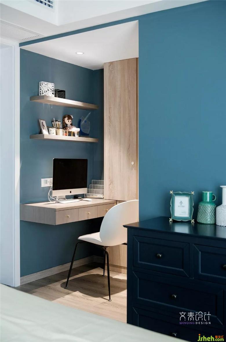 這更衣間兼書房的區(qū)域,原是衛(wèi)生間門過道。封閉后,衛(wèi)生間開到房間里側(cè)。利用這處原先浪費的空間,打造成儲納和功能兼具的小空間。