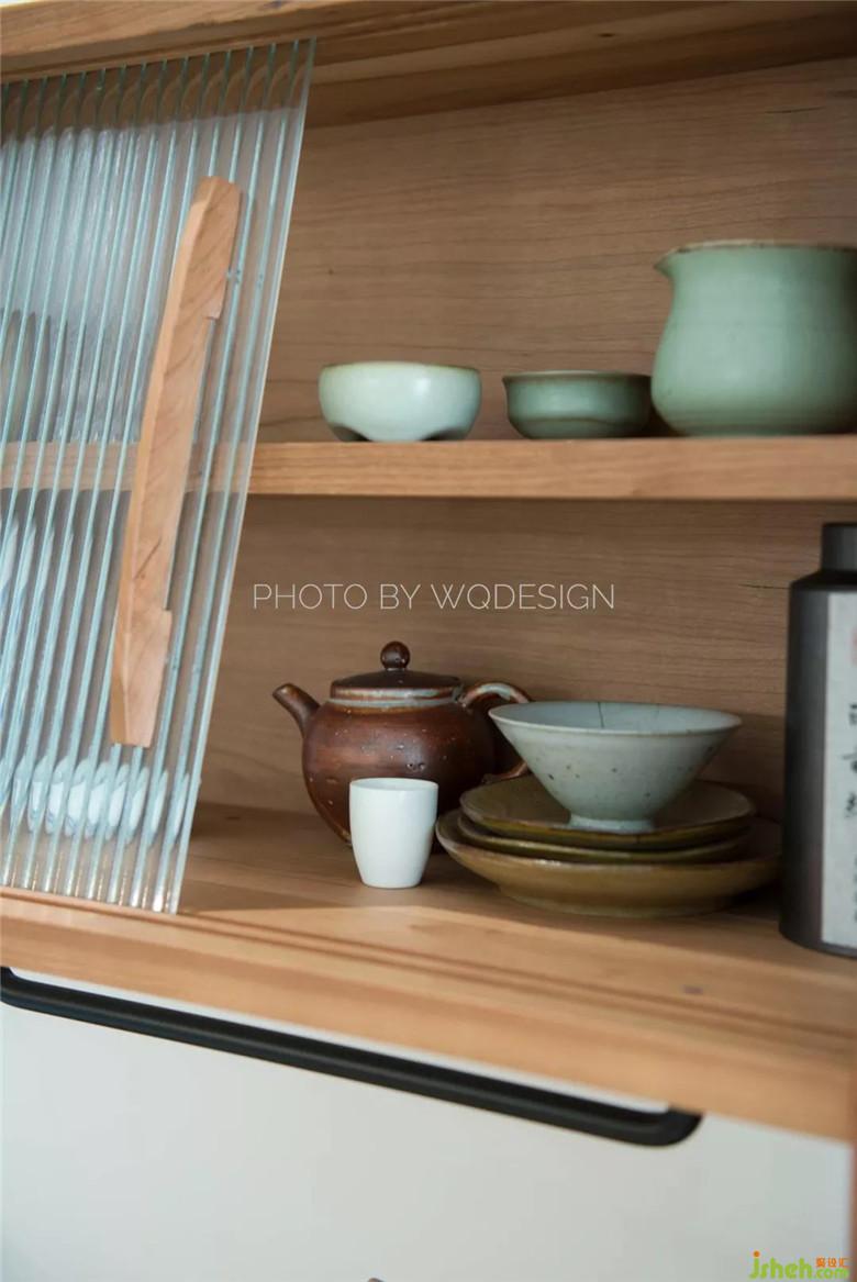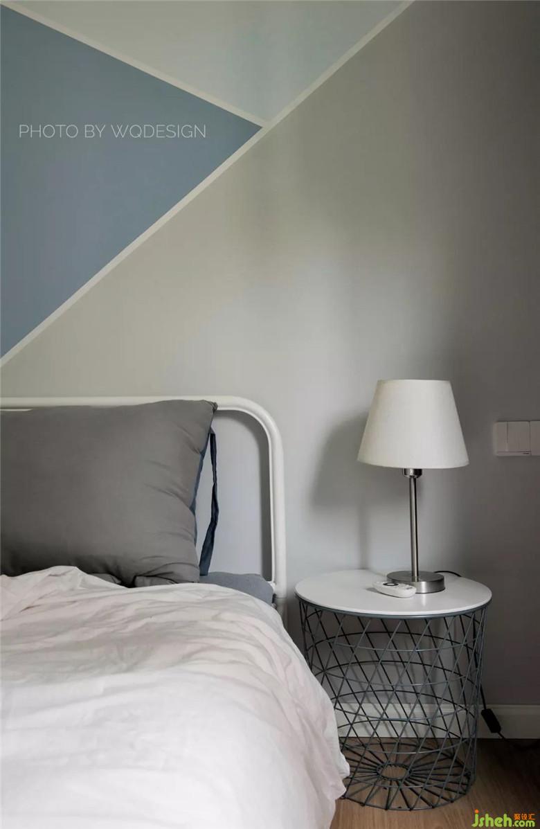 幾何色塊墻面,海藍(lán)、天藍(lán)、灰三種微冷的色調(diào)組合碰撞,糅合成一個(gè)靜謐的空間。