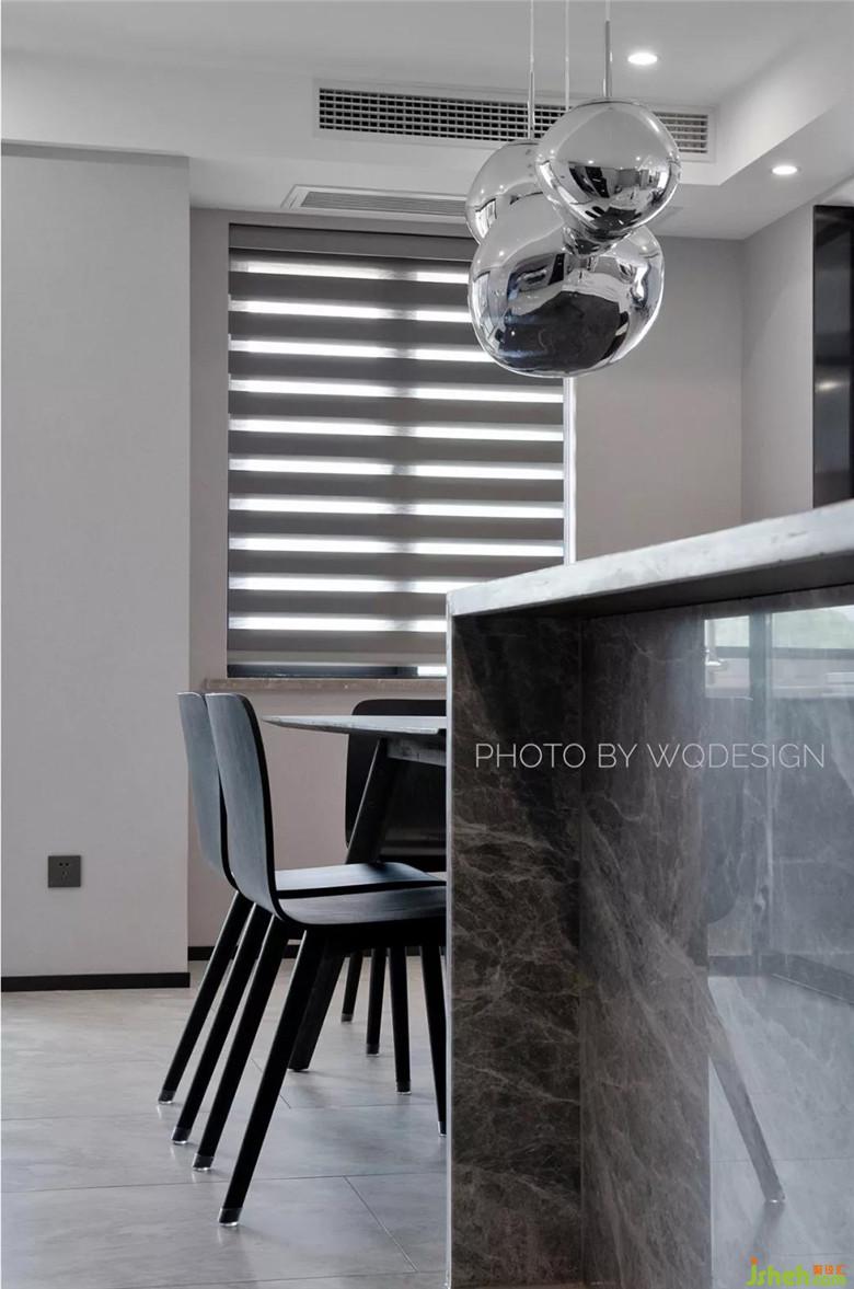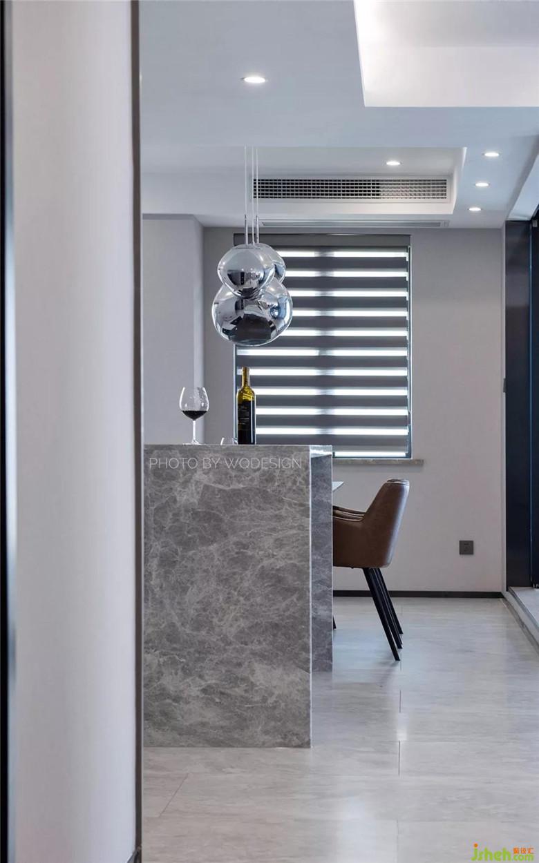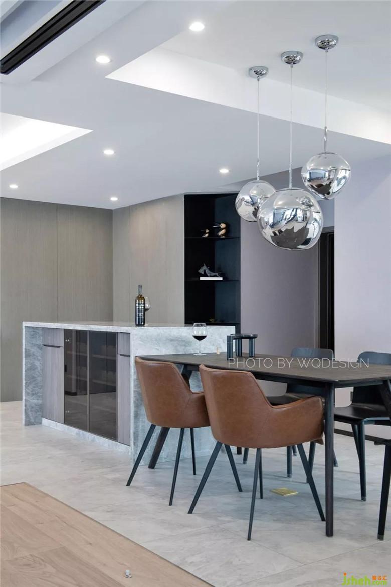 按常規(guī)設計來說,中導一般設計在廚房附近。這里將中導做在入戶門口其實另有深意。女業(yè)主不喜歡一進家門就一眼望盡空曠的客廳,這樣令她沒有安全感。也不喜做一個能阻擋全部視野的入戶門廳。而且這個中導里是一個容量較大的酒柜,使用起來十分方便。