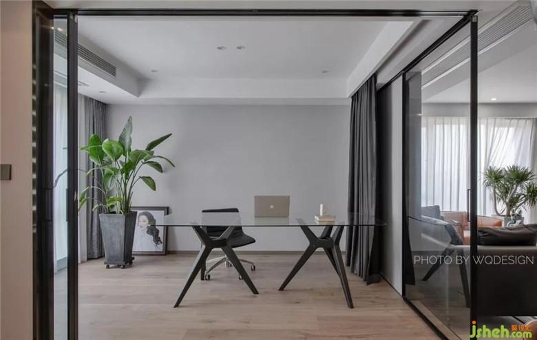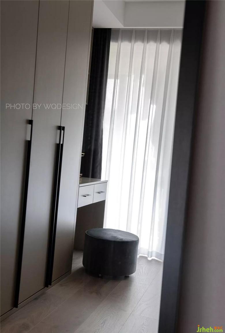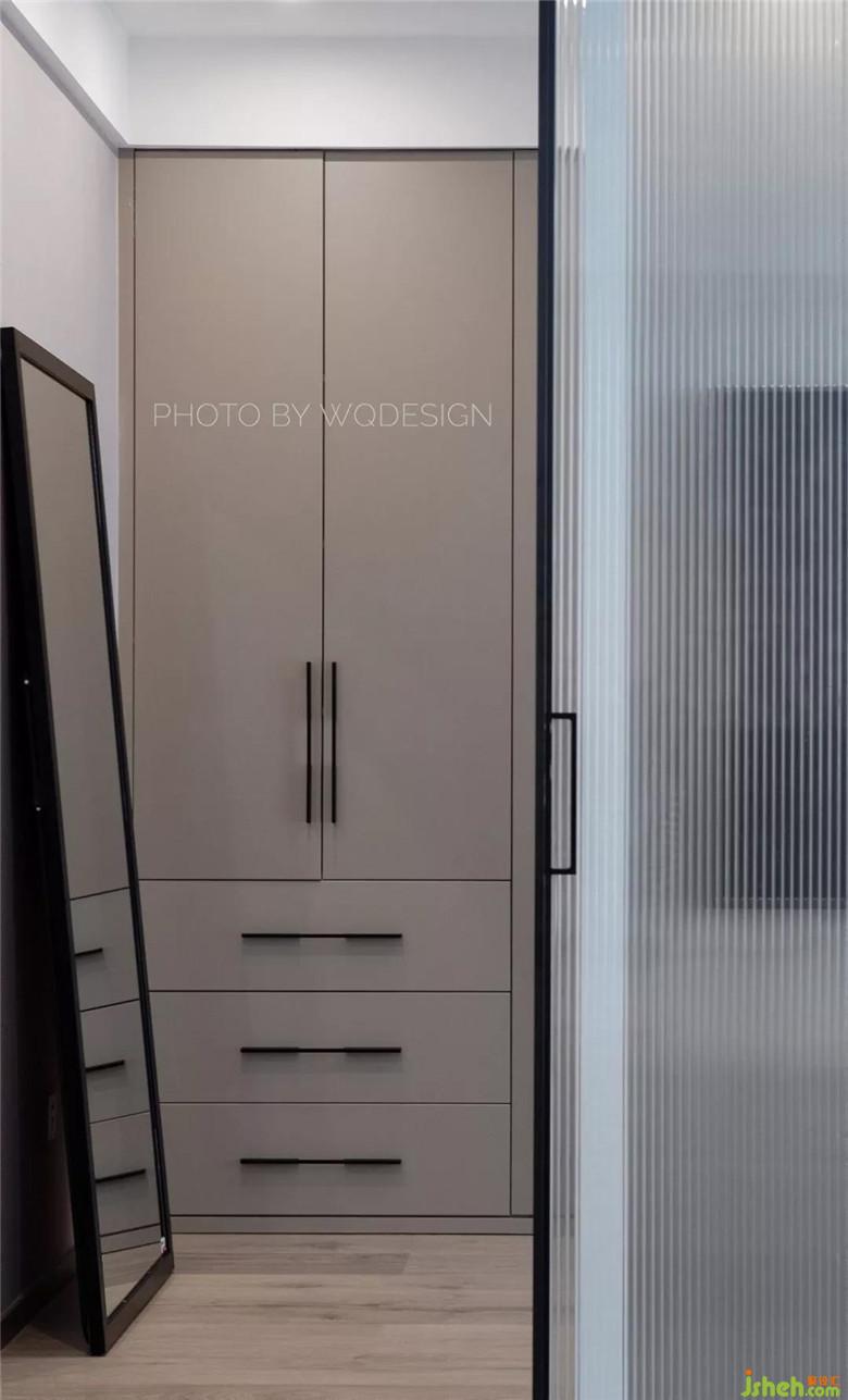 主臥原是兩個臥室,將其中的小臥室改造成步入式衣帽間,兩個空間的隔墻也向衣帽間推進(jìn),增加主臥的面積。兩個空間的隔斷是長虹玻璃門,同時面向公共區(qū)域是隔音較好的移門。夜晚休息、洗漱、早起穿衣可以在主臥一個空間內(nèi)完成,方便、隱私性也極好。