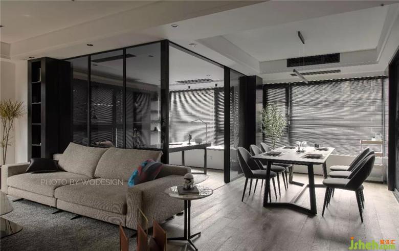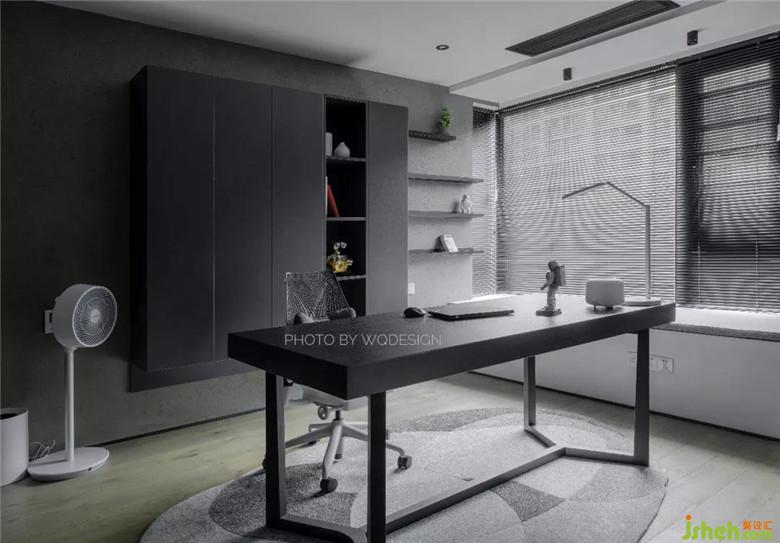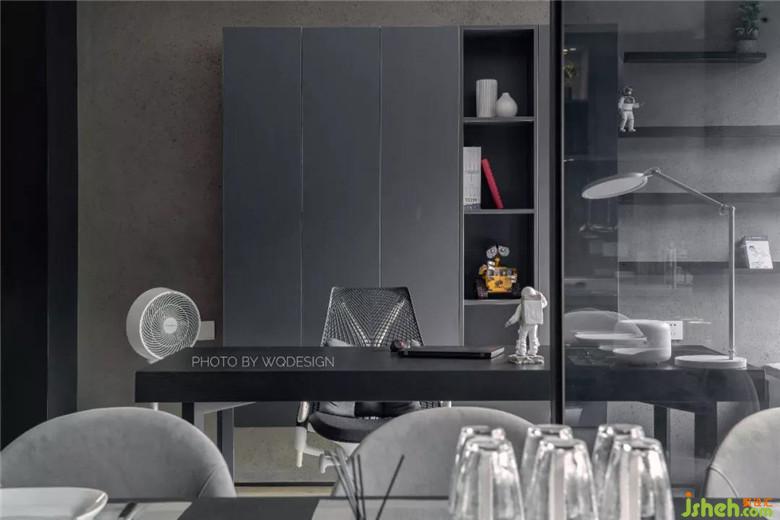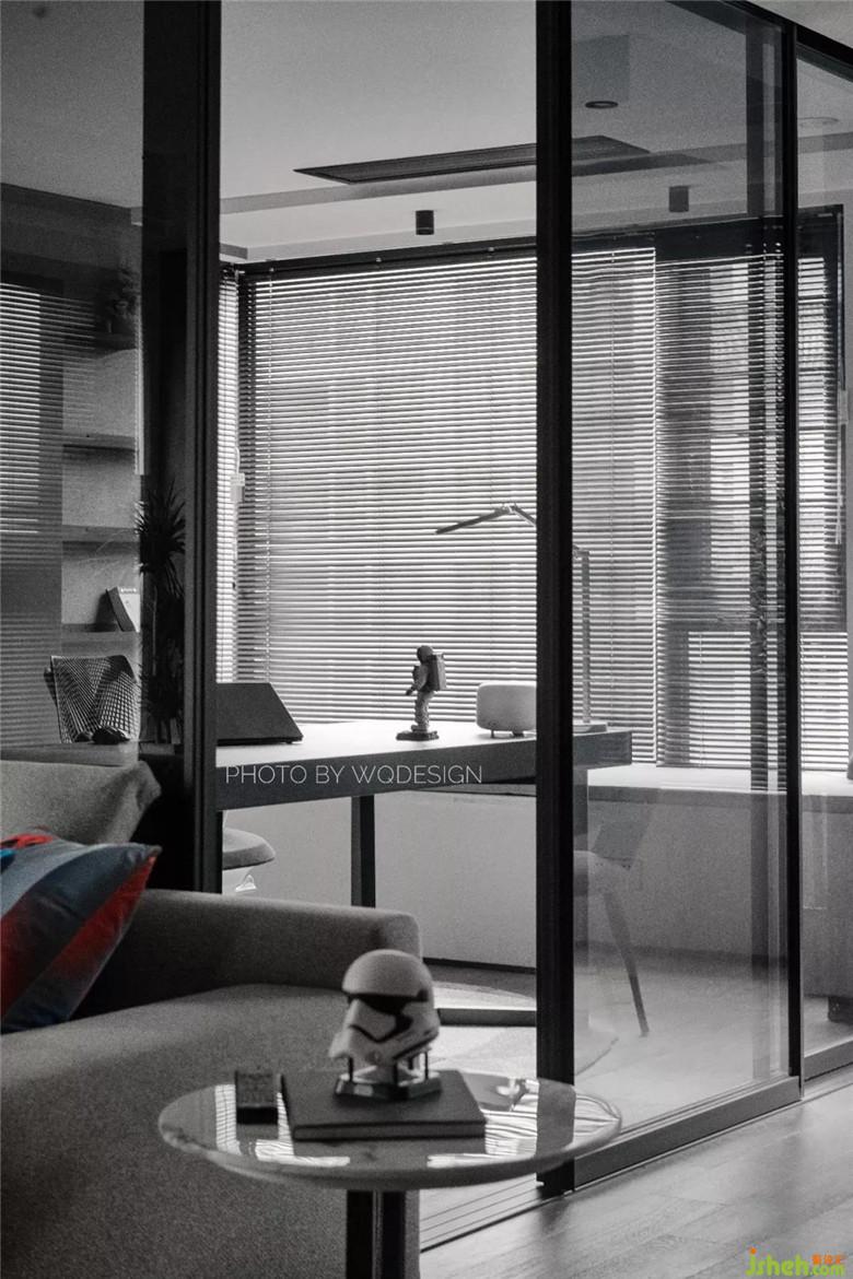 呂先生在和設(shè)計(jì)師對(duì)方案之初,就有把書房留作兒童房之用,因此電源留口都是臥室的配置。但近幾年這里做臥室的話,稍顯浪費(fèi)。因此,將兩面墻體都推倒,用黑玻作隔斷,保證一定的隱私性,空間質(zhì)感也很棒。半開放書柜,開放部分留出作擺件展示,另一部分用作藏書,十分實(shí)用。