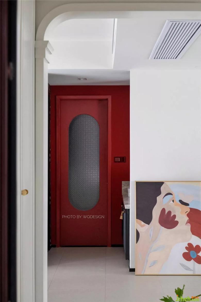 入戶望去即是布達(dá)拉宮紅門墻。長(zhǎng)橢圓造型門洞中的定制瓦楞玻璃弱化了盥洗室門的沖突感,同時(shí)也讓玄關(guān)有了視覺錯(cuò)覺感。裝修公司