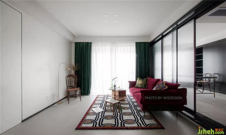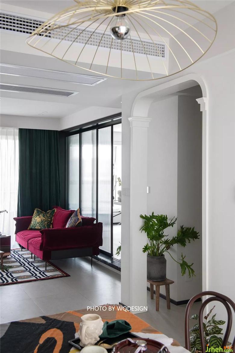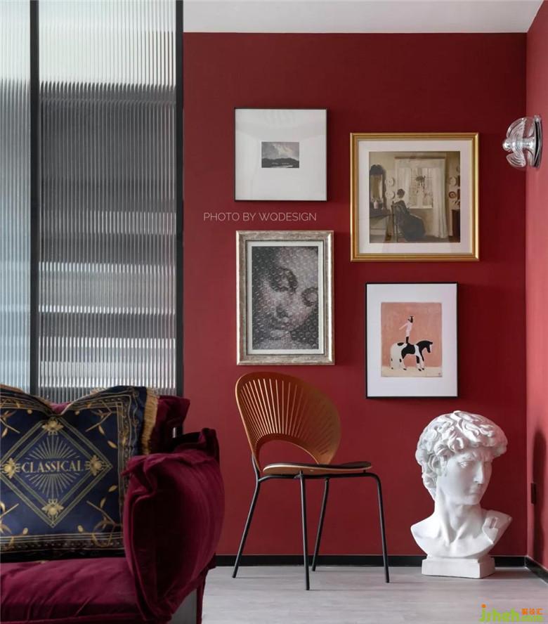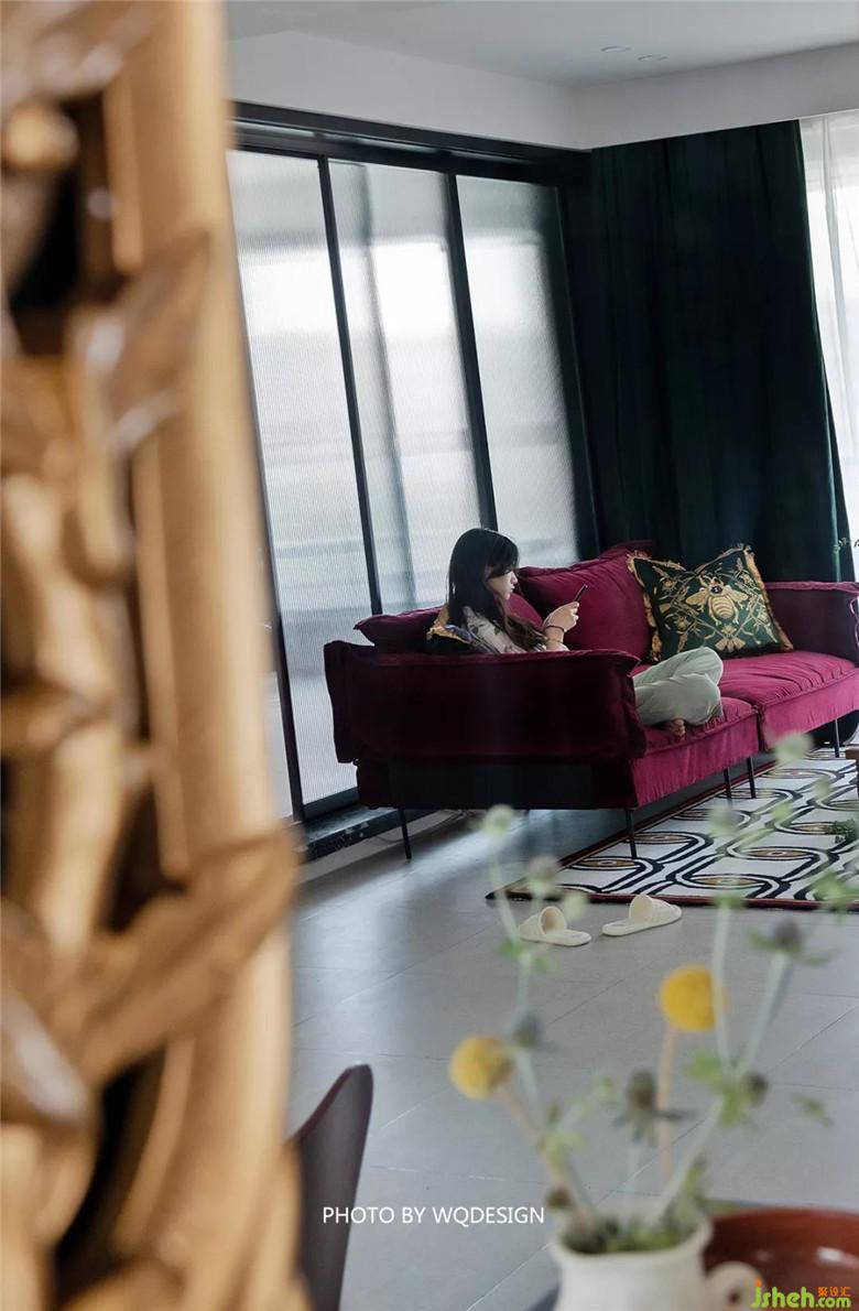 客廳沙發(fā)呼應(yīng)書房的紅墻,玻璃門半開,這里就是一個(gè)小景。