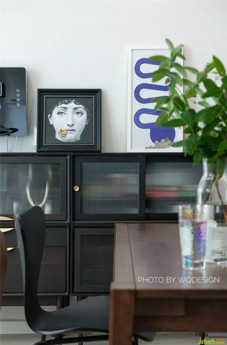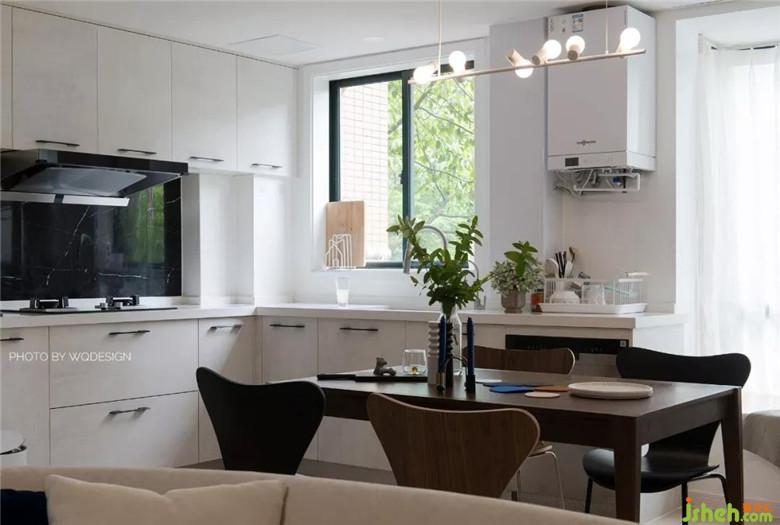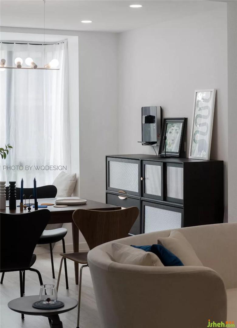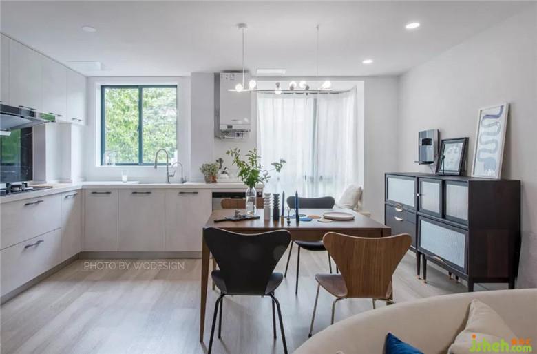 設(shè)計(jì)師:這個(gè)房子的地段很好,又是三樓,所以空間里可以看見小區(qū)里的綠化。想要營造那種比較北歐的調(diào)性,盡量減少視覺的隔斷,原房間與餐廳合并,并與客廳相連,空間就比較通透自然。