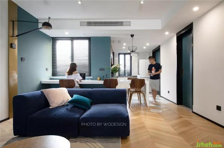 整屋的各處空間都用不同的色塊劃分,主臥的海藍,工作區(qū)的湖藍以及各個家具單品都有選擇地去用藍色系點綴。此處還用銅質(zhì)收邊條壓在客廳和工作區(qū)之間,點綴出輕奢感。