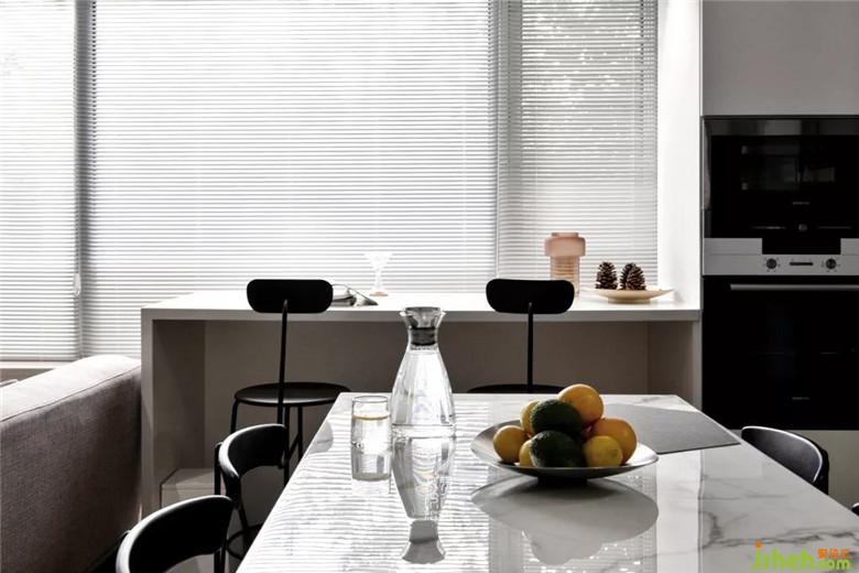 位于餐廳邊的定制書桌,很好地詮釋了功能性。朝南,用百葉簾來控制進光,適合晨起閱讀。下廚、準(zhǔn)備就餐時,也能當(dāng)做導(dǎo)臺使用。