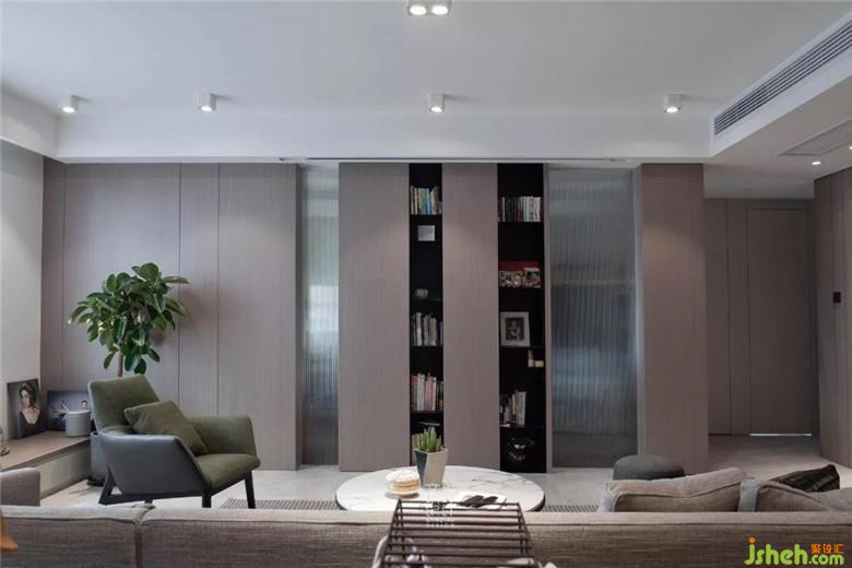 書柜一半是隱形的,一半是露在外面的。簡(jiǎn)單簡(jiǎn)潔的呈現(xiàn)外面,零碎的收納到里面。