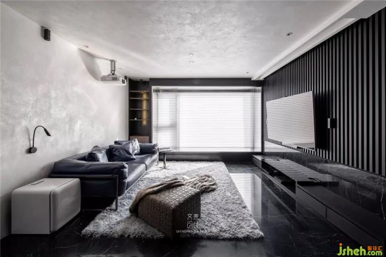 電視背景墻,黑色木頭材質(zhì)的欄珊,結(jié)合黑色大理石拼湊出層次感