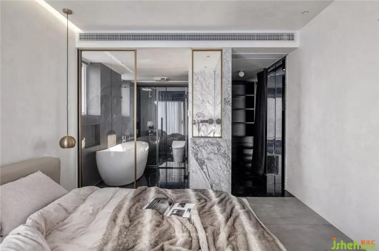 主臥內衛(wèi)干濕分離,干區(qū)用玻璃隔斷,視野通透,但也不必害羞,單身貴族的快樂你可以懂。