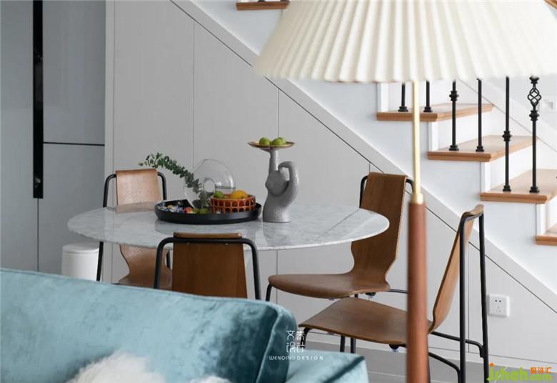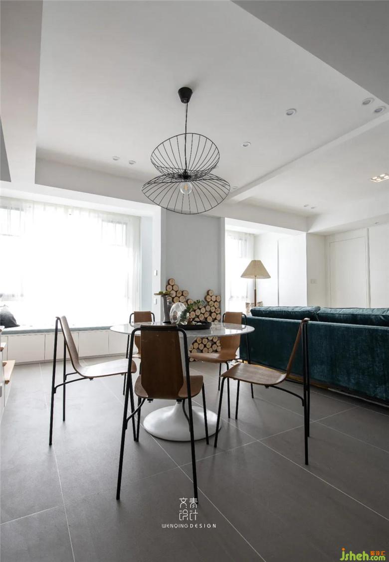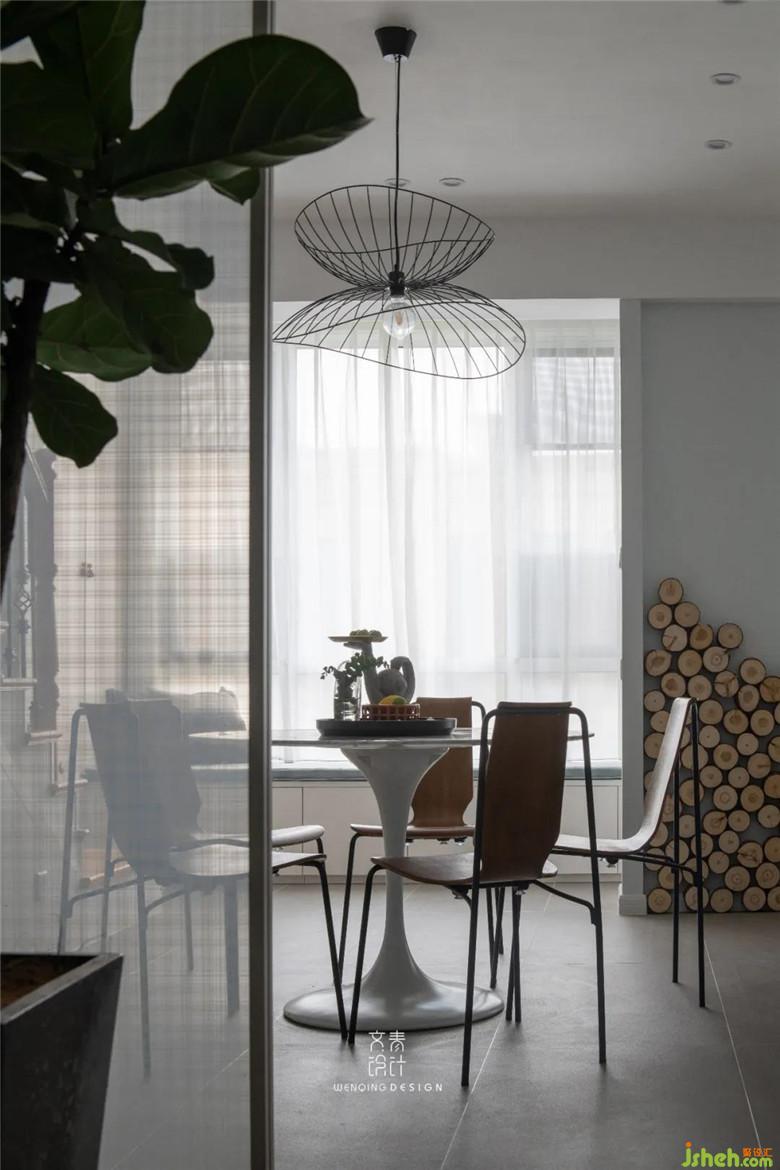 餐廳主要以簡約為主,只用了一盞鐵藝吊燈做裝飾,與客廳僅“一步之遙”,提高了家人之間的互動性。
