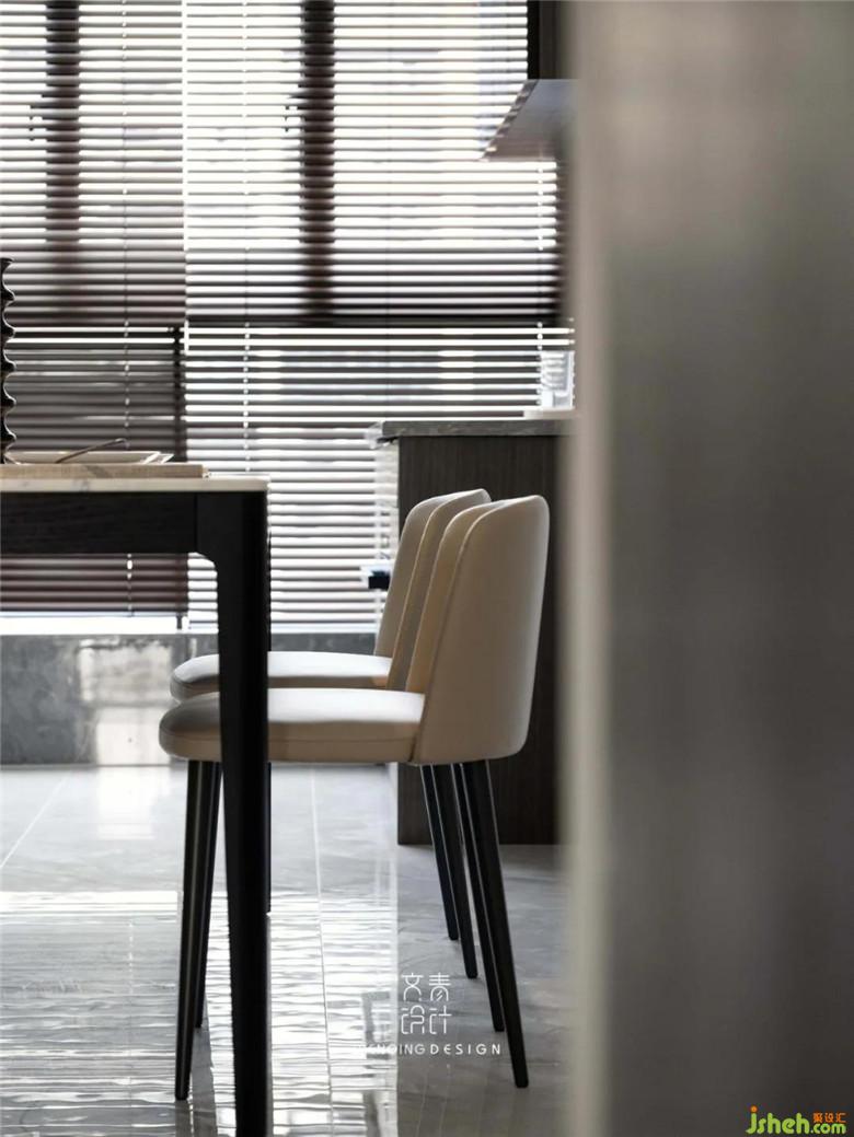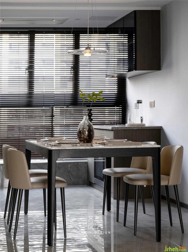 餐廳也有標(biāo)配的陽臺,本著不浪費每一寸自然光的原則,裝修公司采用了有著“光影魔術(shù)手”之稱的百葉簾,業(yè)主有時會在餐桌上辦公,陽臺的矮柜就成了“辦公區(qū)”最好的水吧臺。