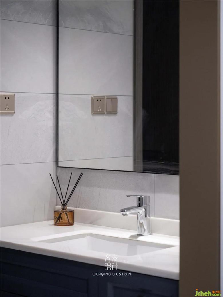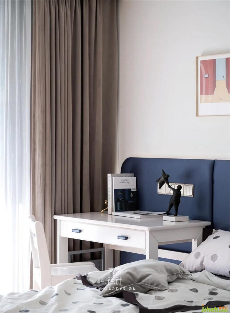我們將次臥的床靠背做了延伸處理,“一物兩用”既是床靠背,又能做為書桌的背景,整體看上去也會更加統(tǒng)一。