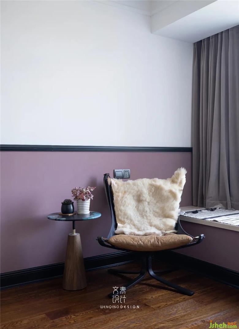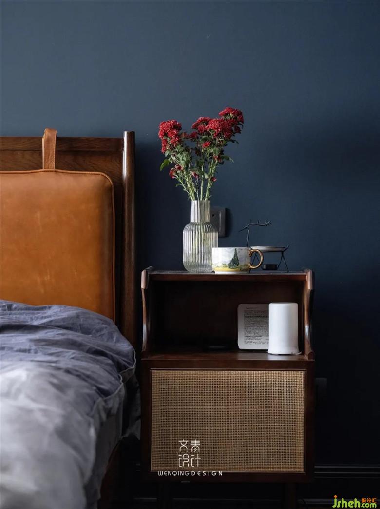 臥室裝修公司采用了海軍藍與淺玫瑰色的一個撞色,似不太搭的兩個色彩,組合起來卻有著奇妙的化學反應。為了讓兩個顏色不顯得突兀,我們降低了顏色飽和度,并現(xiàn)場根據(jù)業(yè)主家不同的光線現(xiàn)場進行略微的調(diào)色。