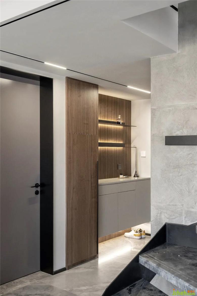 裝修公司在玄關處為未來女主人做了一些小細節(jié),鞋柜一側單獨留了較高的空間用來放靴子,底部抬高的部分也按照女士短靴高度來設計,不得不說,小金為未來女主人是真上心。