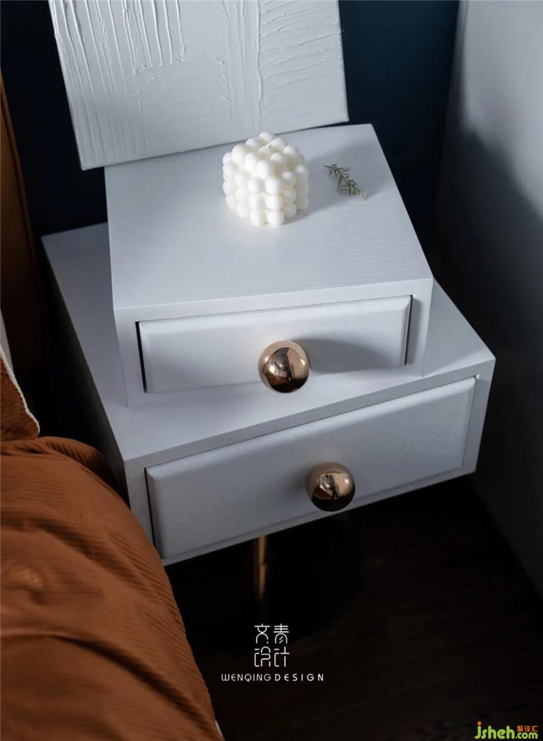 床頭為十一專(zhuān)門(mén)定制了梳妝臺(tái),給生活小小的儀式感,床頭柜也采用梳妝盒造型,小首飾和日常物品也能有分類(lèi)。