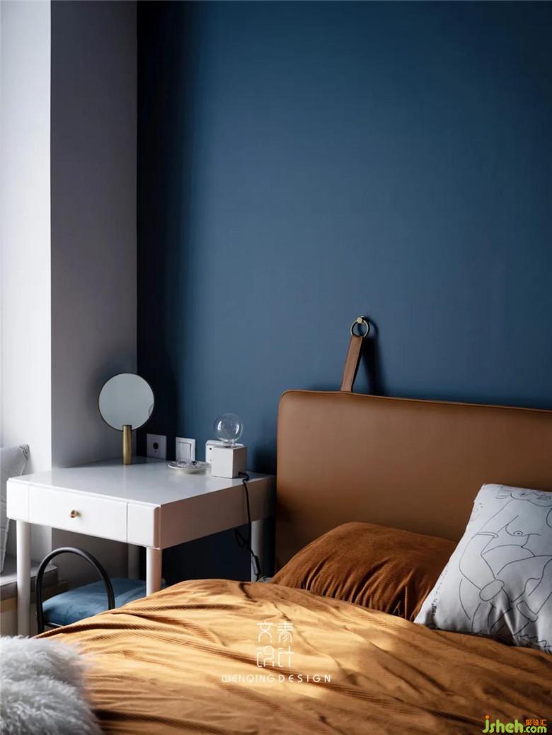 臥室精裝修的吊頂沒(méi)做修改,三面墻都刷了湖藍(lán)色乳膠漆,顏色跟上吊頂,裝修公司弱化了原始吊頂?shù)膹?fù)雜石膏線走邊,靠窗的墻選擇留白,陽(yáng)光透過(guò)窗戶(hù)散落,既能達(dá)到業(yè)主想要的靜謐感,整體空間也不會(huì)壓抑。
