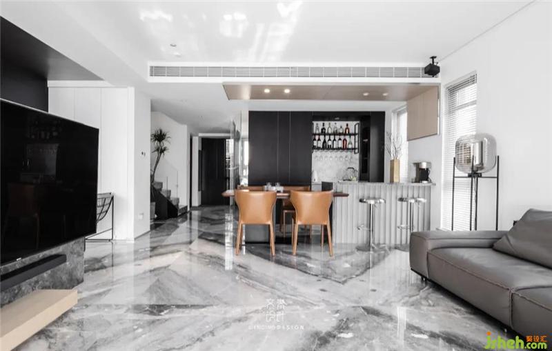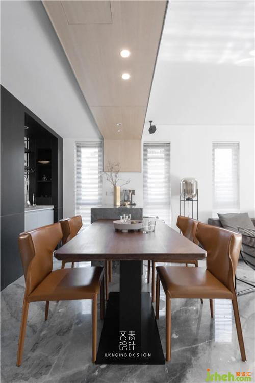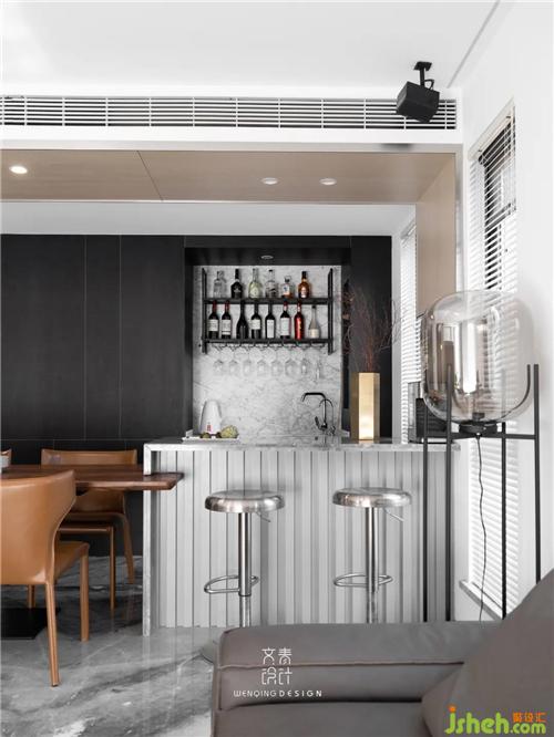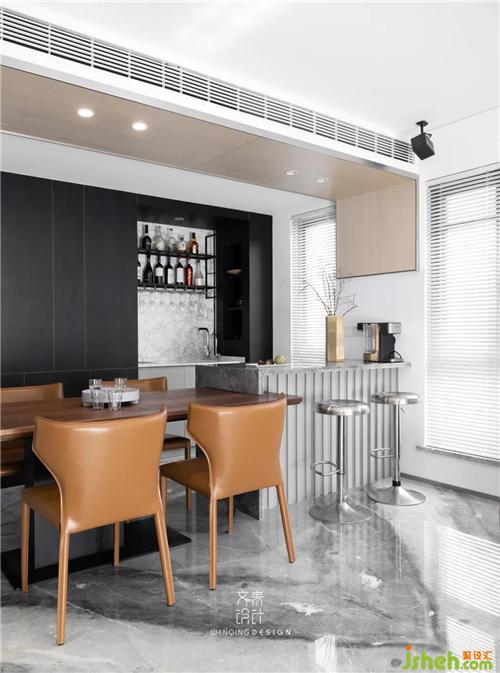 餐廳鏈接吧臺做一體設(shè)計,餐桌錯位嵌入吧臺,將不對稱裁剪引用設(shè)計中,增加了簡約的精致和舒適,吧臺又能供業(yè)主閑暇時小酌一杯。