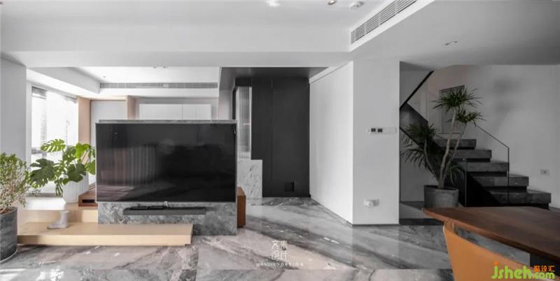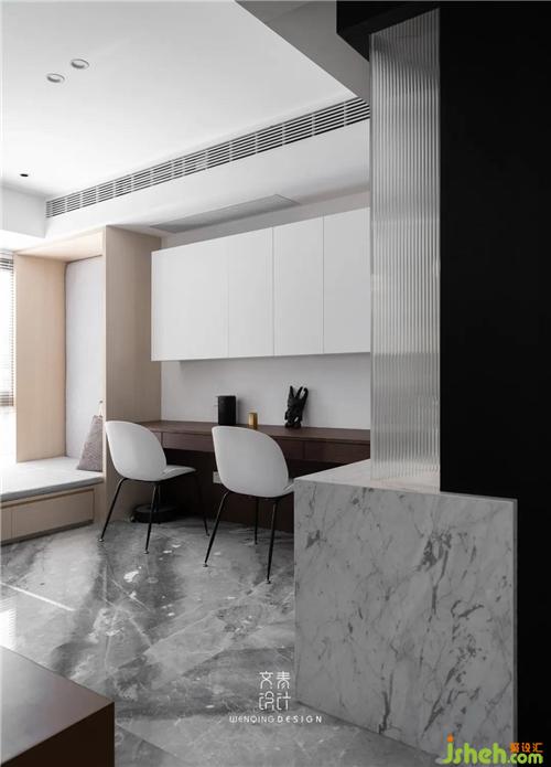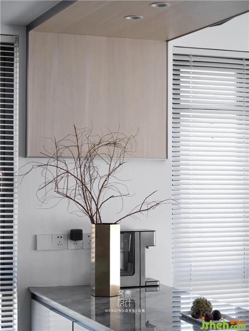 書房旁的公衛(wèi)采用不銹鋼吊頂,獨(dú)樹一幟的設(shè)計(jì),往往能讓人眼前一亮,不銹鋼材質(zhì)從頂延伸至墻面,與木飾面、玻璃和大理石形成材質(zhì)反差,讓視覺直觀體驗(yàn)到設(shè)計(jì)的碰撞感。