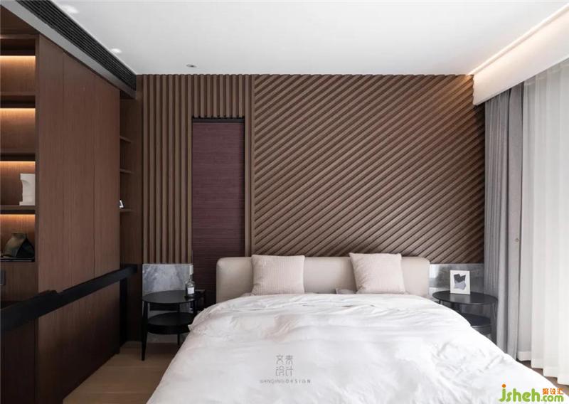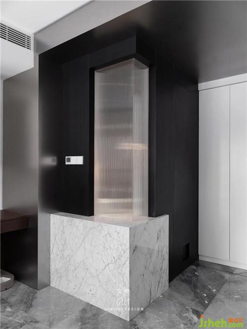 主臥進(jìn)門處吊頂延續(xù)不銹鋼材質(zhì),門框、踢腳線也運(yùn)用相同材質(zhì)延伸,營(yíng)造設(shè)計(jì)延展統(tǒng)一性。轉(zhuǎn)角處的直墻采用圓角處理,減弱直墻硬朗線條的沖突感,中部鏤空嵌入金屬裝置,用剛?cè)岵?jì)四字形容足以。