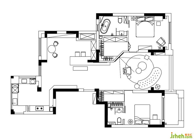 1. 將主衛(wèi)墻體內(nèi)推,敲掉客廳三分之一的背景墻,借用客廳空間新砌斜墻,為主臥配備衣帽間。