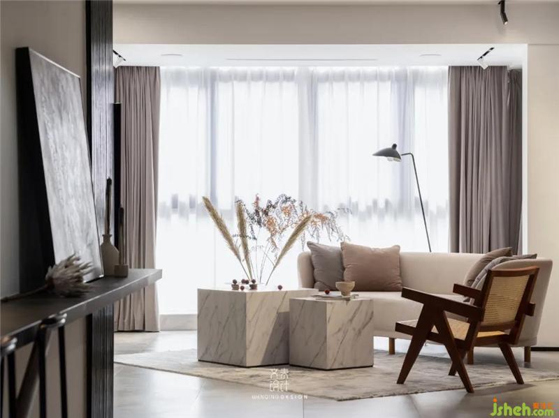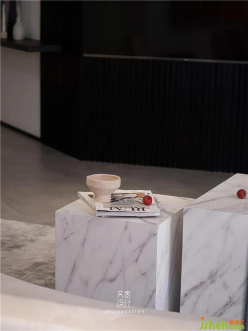舒適坐感的絨布,保證最舒服最放松的居住體驗(yàn),搭配大理石質(zhì)感的茶幾,杭州裝修設(shè)計(jì)一柔一剛的碰撞,反而豐富了空間層次感。