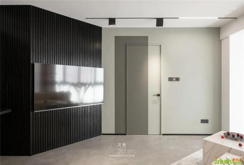 客廳原本背景墻被敲掉三分之一,僅剩不多的空間又被主臥房門分去三分之一,新砌斜墻就成了電視背景的最佳選擇,定制豎條格柵拉伸層高延伸感,主臥房門也用乳膠漆色塊裝飾,將設(shè)計(jì)趣味性進(jìn)行到底。