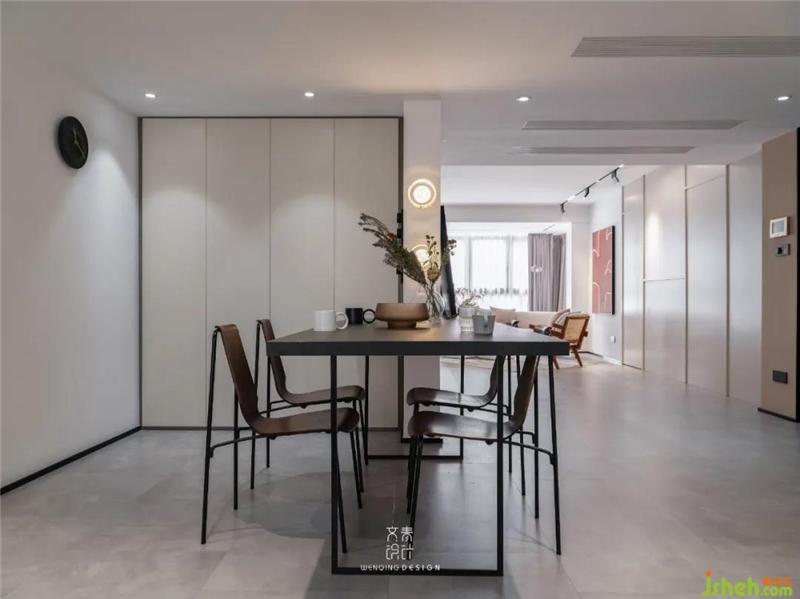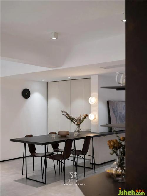 拆除原本書房墻體,與餐廳合并做成一體式開放空間,餐桌旁定制儲(chǔ)物柜,保證公共空間的收納功能。