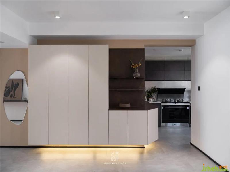 左側(cè)的玄關(guān)鏡,供人出門前整理妝容,定制懸空儲(chǔ)物柜延伸進(jìn)廚房,杭州裝修設(shè)計(jì)柜體轉(zhuǎn)角用斜角處理,減弱對(duì)角給人的擁擠感,小小細(xì)節(jié)也能注入設(shè)計(jì)的巧思。