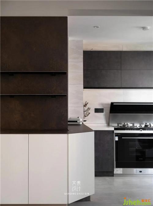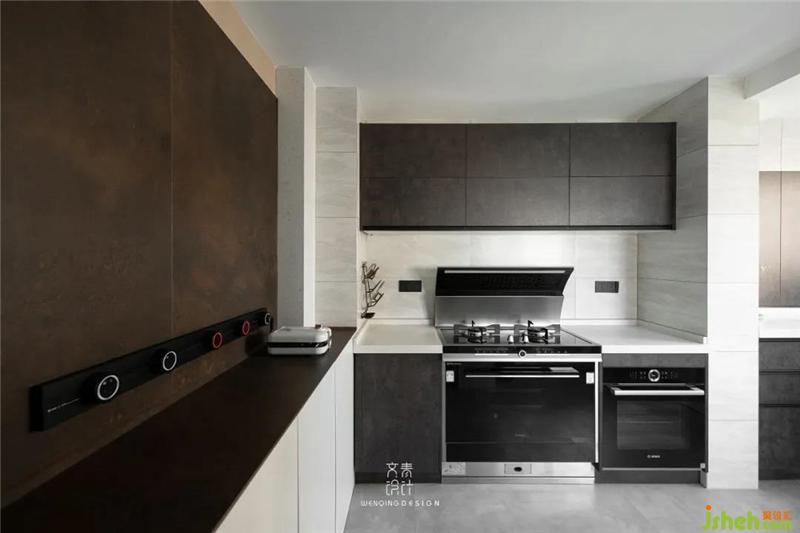 廚房操作臺面被墻體分成兩段,延伸進廚房的儲物柜,剛好彌補了這一缺陷。墻面安裝可隨意移動軌道插座,滿足小廚電使用。