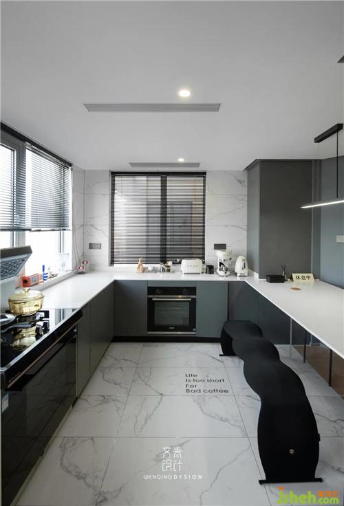原本入戶是局促的廚房空間,我們敲掉廚房與書房的隔墻,做成開放式餐廚空間,這樣廚房就能擁有三面窗,擴(kuò)大使用空間和采光面積杭州裝修設(shè)計(jì)。