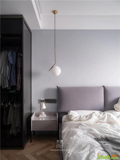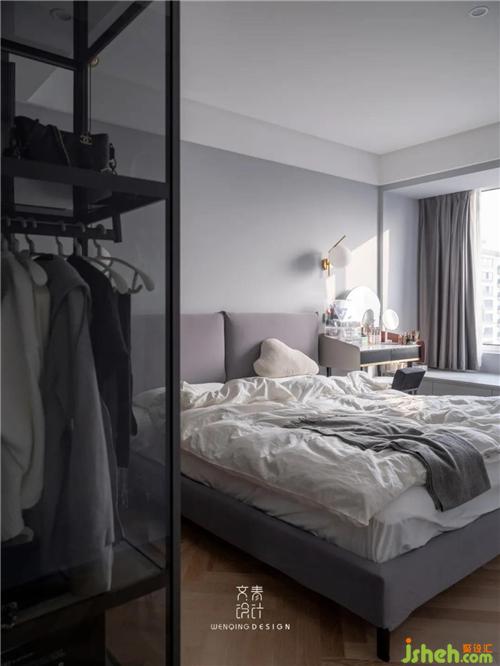 主臥將衛(wèi)生間改成衣帽間,釋放全部墻體空間,用簡(jiǎn)單的玻璃柜塑造衣帽間,杭州裝修設(shè)計(jì)將一絲一毫的墻體空間都納入衣帽間收納所用。