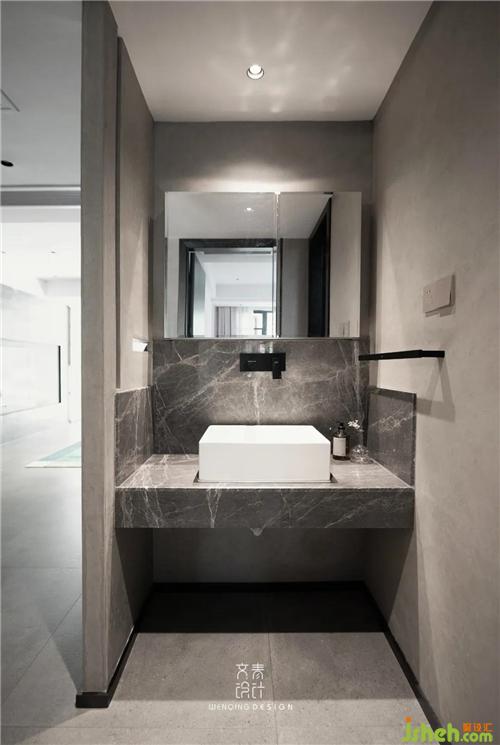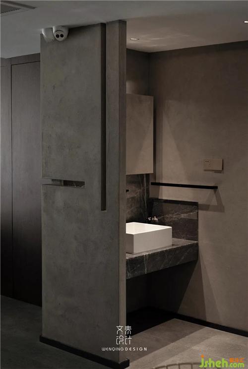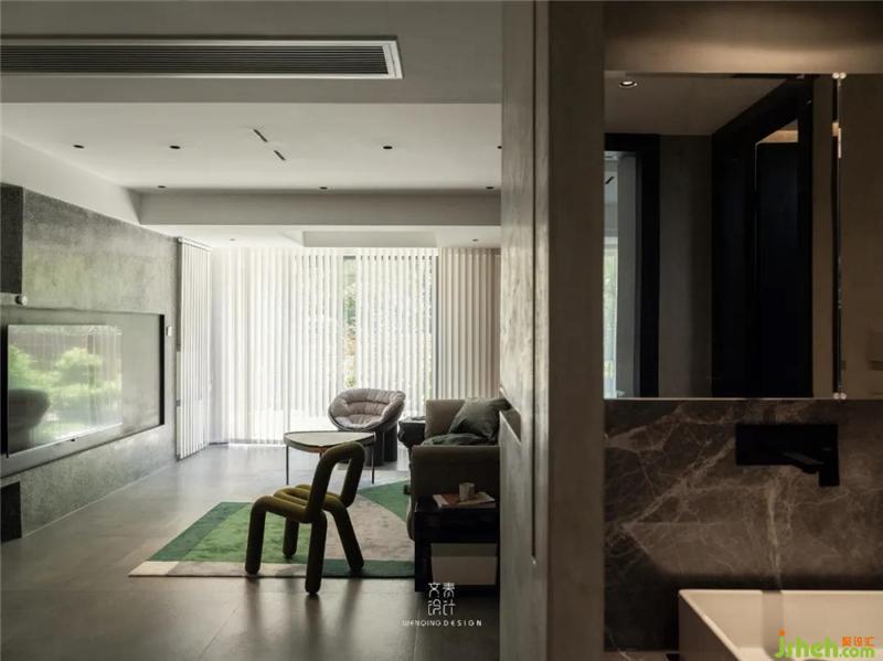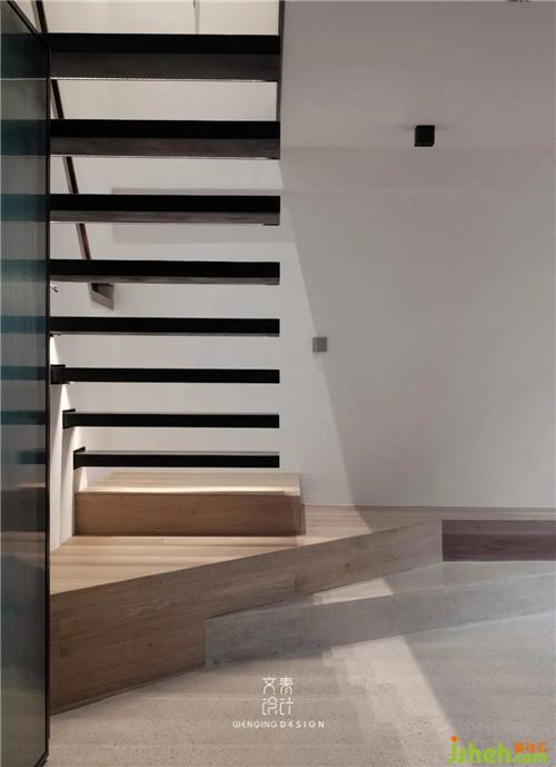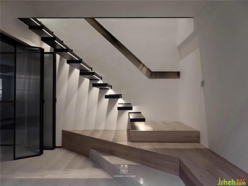 懸浮式樓梯底部暗藏?zé)魩?,光影交錯(cuò)之間賦予了空間動(dòng)態(tài)的美感,地下室用水泥臺(tái)階銜接過渡,材質(zhì)之間的交融,順勢將人帶入水磨石地下室空間。