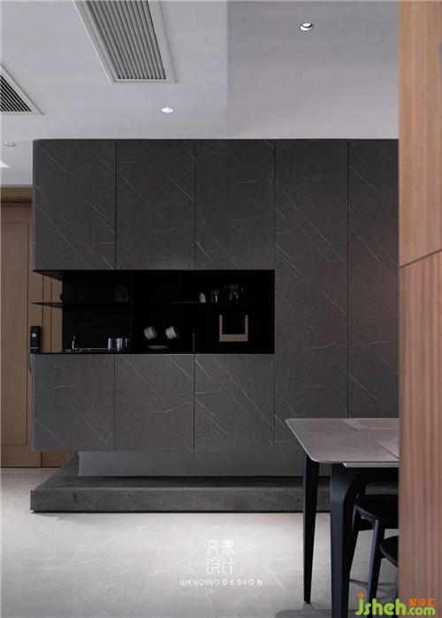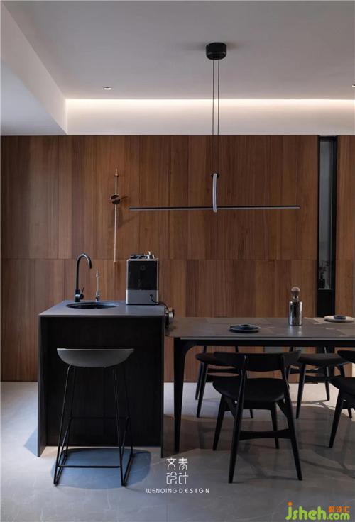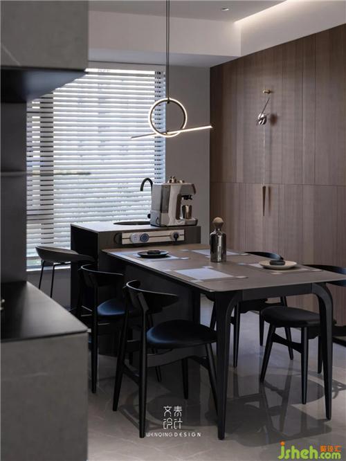 溫潤(rùn)的木飾面浸潤(rùn)整個(gè)空間,深灰的餐桌如同林中磐石,所有造型,材質(zhì),光線都在設(shè)計(jì)的交融下回歸自然,一種壓倒性的溫暖質(zhì)感,在空間中慢慢暈開(kāi)。