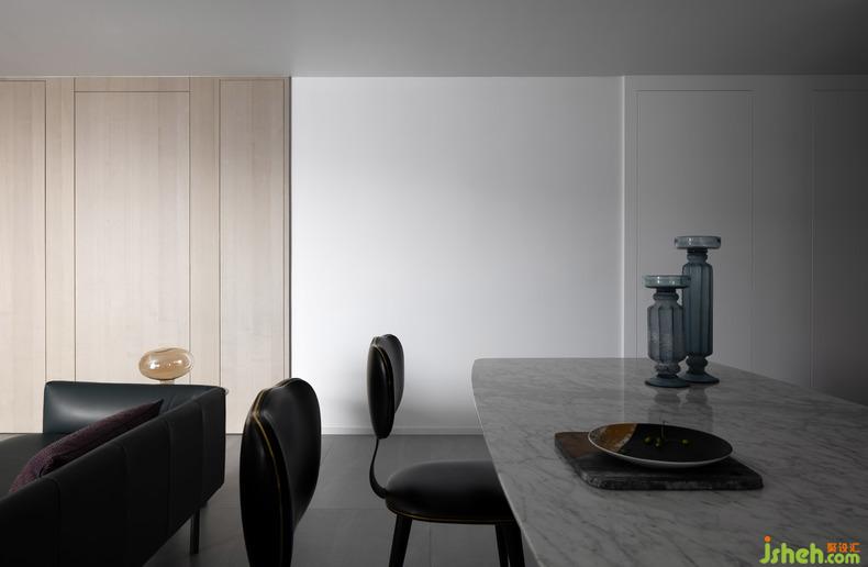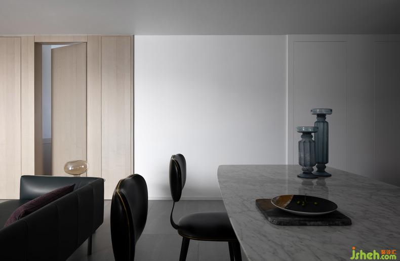 沙發(fā)背后的空間讓渡給了用餐區(qū),一張長長的大理石方桌,室內(nèi)設(shè)計師便足以承載一場大型的家庭聚會。餐桌上的陶瓷擺件,成為了素雅空間里的一抹亮色,為屋主的日常生活帶來了雅致的情趣。