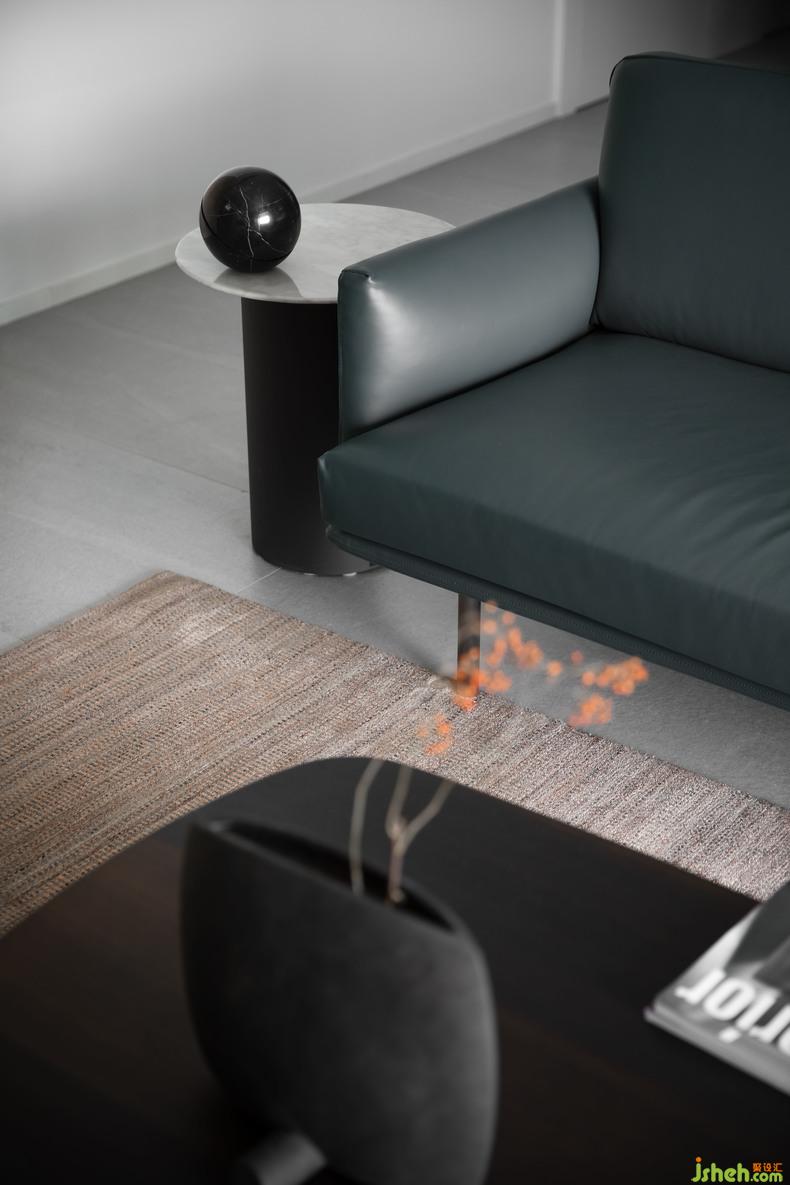 客廳是空間風格展示的第一站,也是整個家庭裝修風格的定調(diào)。室內(nèi)設(shè)計師為保留空間的簡單優(yōu)雅,客廳并沒有放置過多的裝飾,銅銹綠的皮質(zhì)沙發(fā)安放于整個空間的正中線,與茶幾上的紅梅花藝相互呼應,在共作一副極具意境的紅梅映雪圖之時,將客廳空間一分為二。